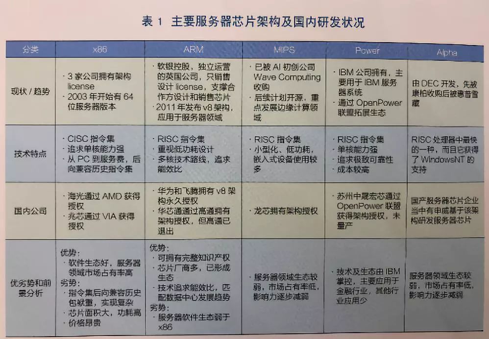 中游IT基礎設備部分,以服務器好存儲為例,國內廠商大力投入研發資源,當前,除核心芯片外,我國服務器零部件國產化率已經超過60%。但是當前的主要瓶頸,還是無論在服務器、存儲還是網絡設備領域,X86架構芯片都占據較大的市場份額。我國云計算IT基礎設備廠商在積極研發自主可控的非X86架構芯片,目前應用較多的是基于ARM架構的華為鯤鵬芯片泰山服務器、基于天津飛騰芯片的服務器。