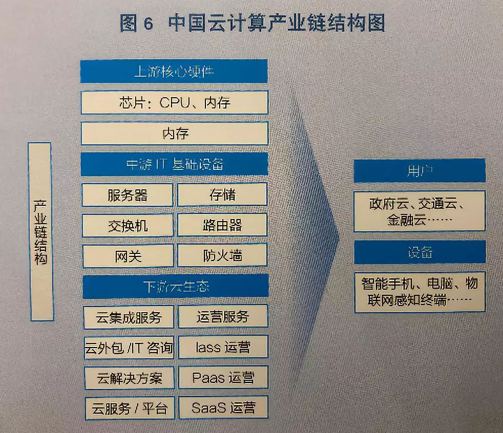 白皮書也重點分析了中國云計算產業鏈的基本情況。按照產業機構來看,云計算產業鏈可以分為上游核心硬件,包括芯片、CPU、內存、閃存;中游IT基礎設備,包括服務器、存儲設備、網絡設備等;以及下游云生態,包括基礎平臺、云原生應用等三部分。