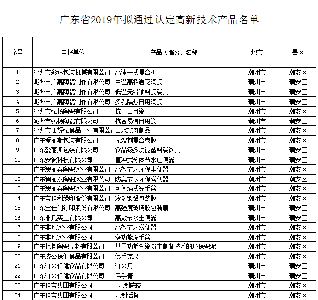 根據《關于組織申報廣東省2019年高新技術產品認定的通知》(粵高企協(xié)〔2019〕8號)的要求,經企業(yè)申報、專家評審等規(guī)定程序,2019年廣東省高新技術產品認定評審工作已完成。高速干式復合機 等33030項產品擬認定為廣東省高新技術產品(名單見附件),現予以公示,公示期為5個工作日(11月21日截止)。